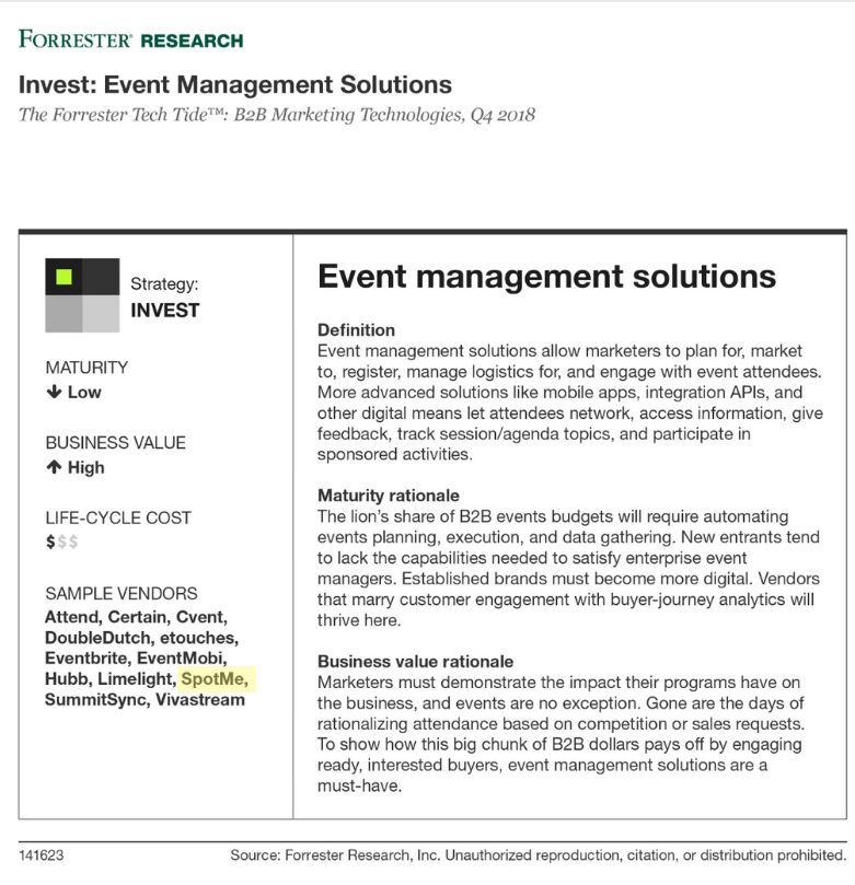 In The Forrester Tech Tide™: B2B Marketing Technologies, Q4 2018, Forrester identified event management solutions as a high business-value investment.