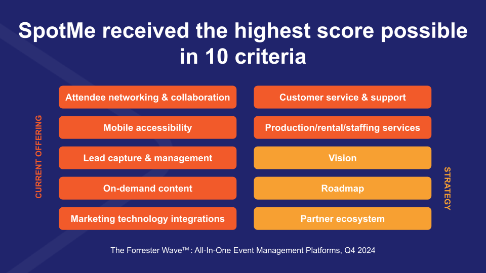 Let’s face it, the event technology landscape is difficult to navigate. On a recent analyst call (not Forrester), it was pointed out to me that buyers find it difficult to differentiate one solution from another, especially when vendor websites are carbon copies (“I could literally replace your logo with any competitor on your website and I could not tell the difference”). Fair point. Ergo, the depth and breadth of the Forrester Wave is one of the few resources that helps buyers cut through the noise and understand what makes each solution unique.