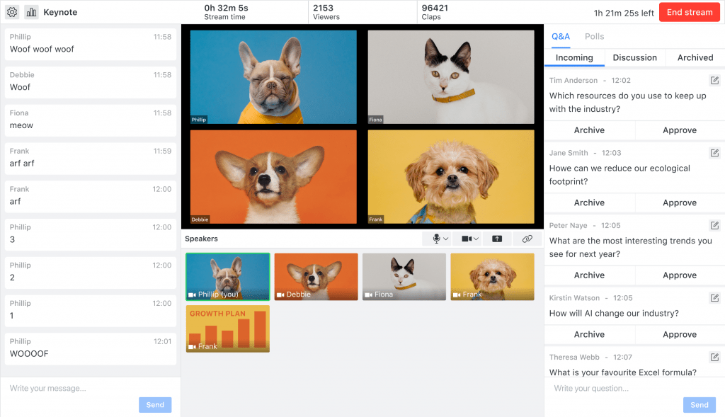 Speakers can use the speaker-chat to coordinate the presentation, approve Q&A questions, see real-time polling results and real-time applause stats.