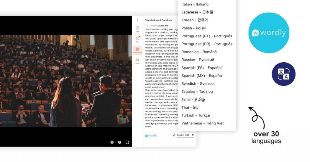 Wordly is an example of AI-powered captioning and translation software that makes this easy for participants at any event format. When the live stream begins, participants see a ‘Translations’ button’ in the side panel in the live session on the event platform. They can simply select the language, and the translations will instantly start to appear. The text appears in real time as the speakers are talking on stage, and users can at any time change the language output using the dropdown.